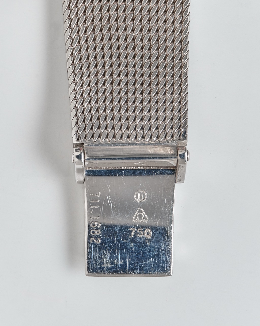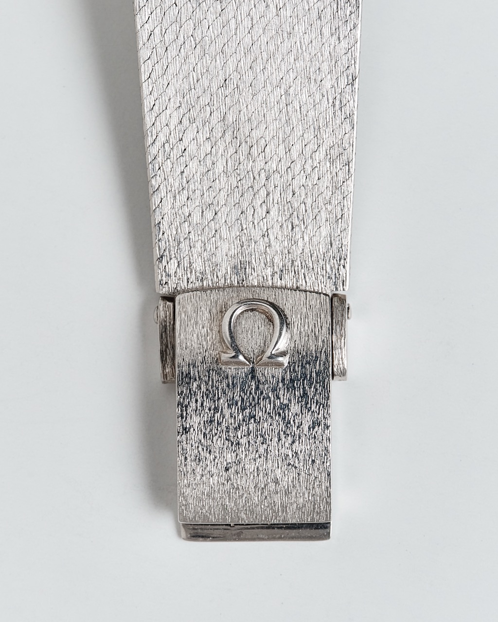 This Omega De Ville watch, created in collaboration with Andrew Grima, embodies the sculptural elegance of 1970s design. Crafted in 18k white gold and paired with an integrated white-gold bracelet, the piece presents a refined interplay of form, texture, and proportion. Its slender rectangular case frames a brushed silver dial beneath an emerald-cut crystal, whose sharp facets enhance the watch’s architectural character. Powered by a manual-wind movement and preserved in new-old-stock condition, it stands as a rare and expressive example of design-led Swiss watchmaking.