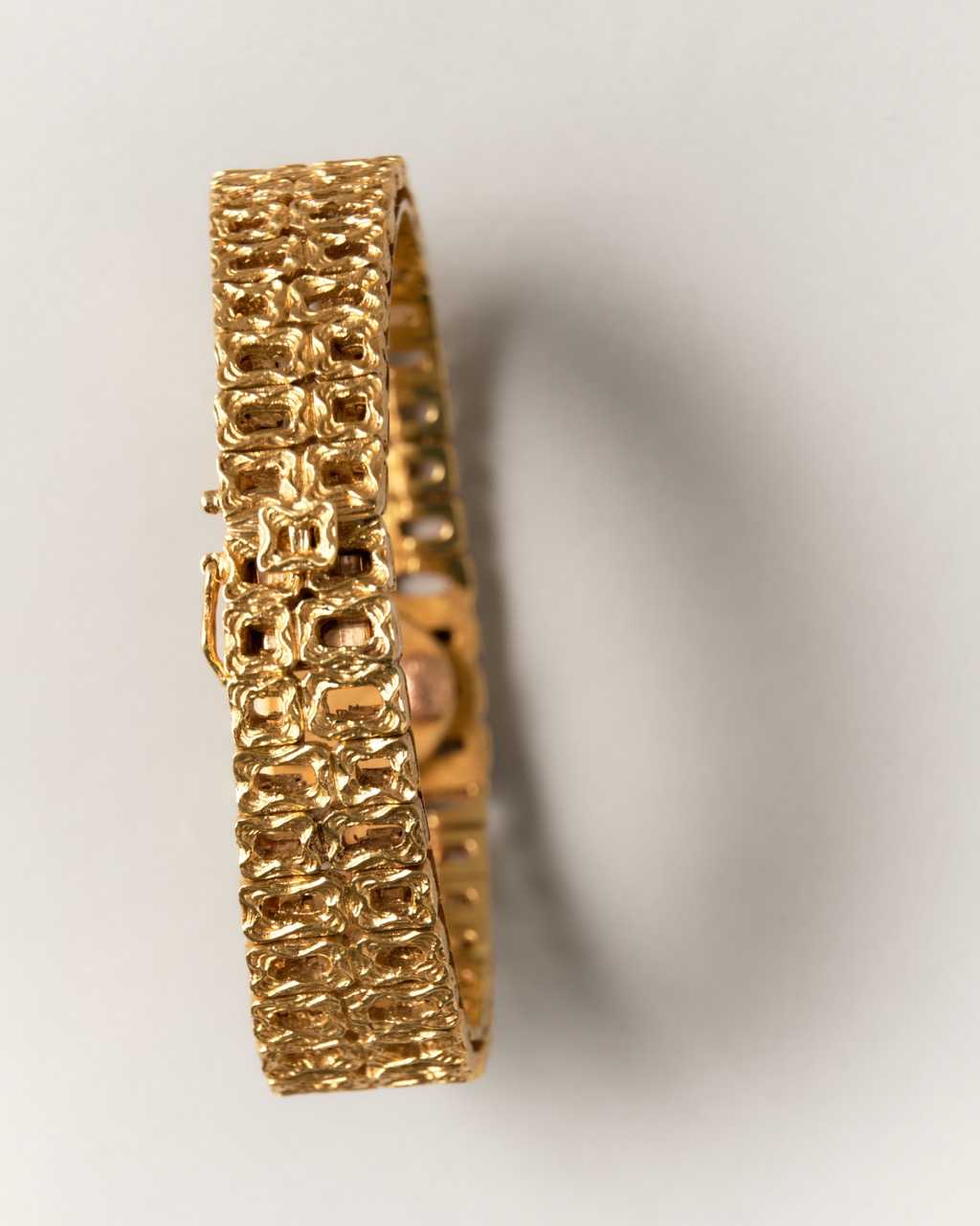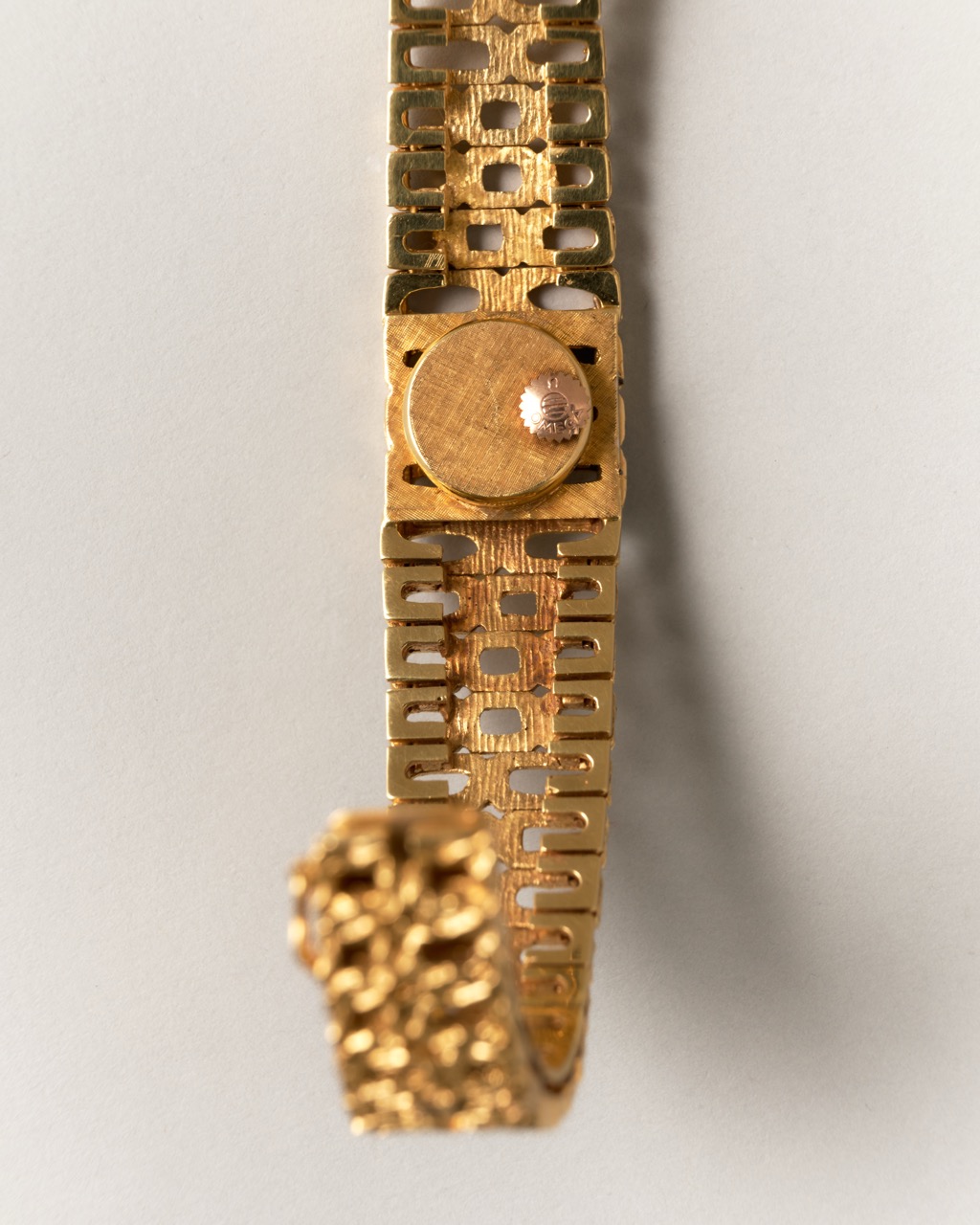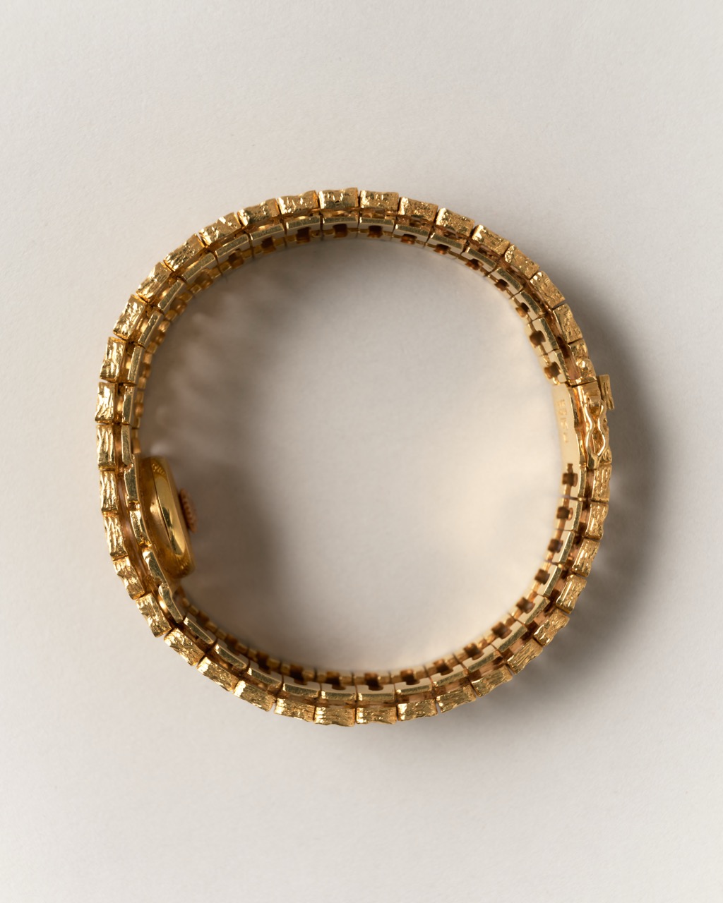 Hidden-dial watches from this period were created to function as adornment first, reflecting a time when luxury watchmaking intersected directly with haute jewelry. The integration of the case seamlessly into the bracelet creates a continuous gold form, emphasizing texture and volume rather than legibility.