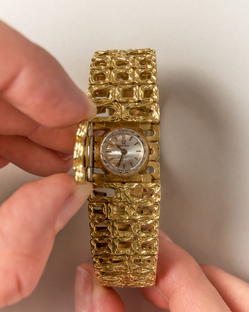This Omega hidden-dial bracelet watch, attributed to the design language of Gilbert Albert, is a striking example of mid-century sculptural watchmaking. Crafted in 18k yellow gold, the piece conceals its white dial beneath an intricately textured bracelet, allowing the watch to present first as jewelry and only second as a timepiece. Measuring approximately 18 mm at the dial and powered by a manual-wind movement, it embodies an era when design, craftsmanship, and artistic expression took precedence over convention. Preserved in new-old-stock condition with hangtags, it stands as a rare and compelling object of 1960s design.