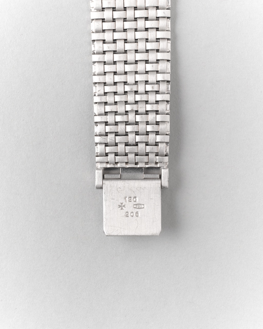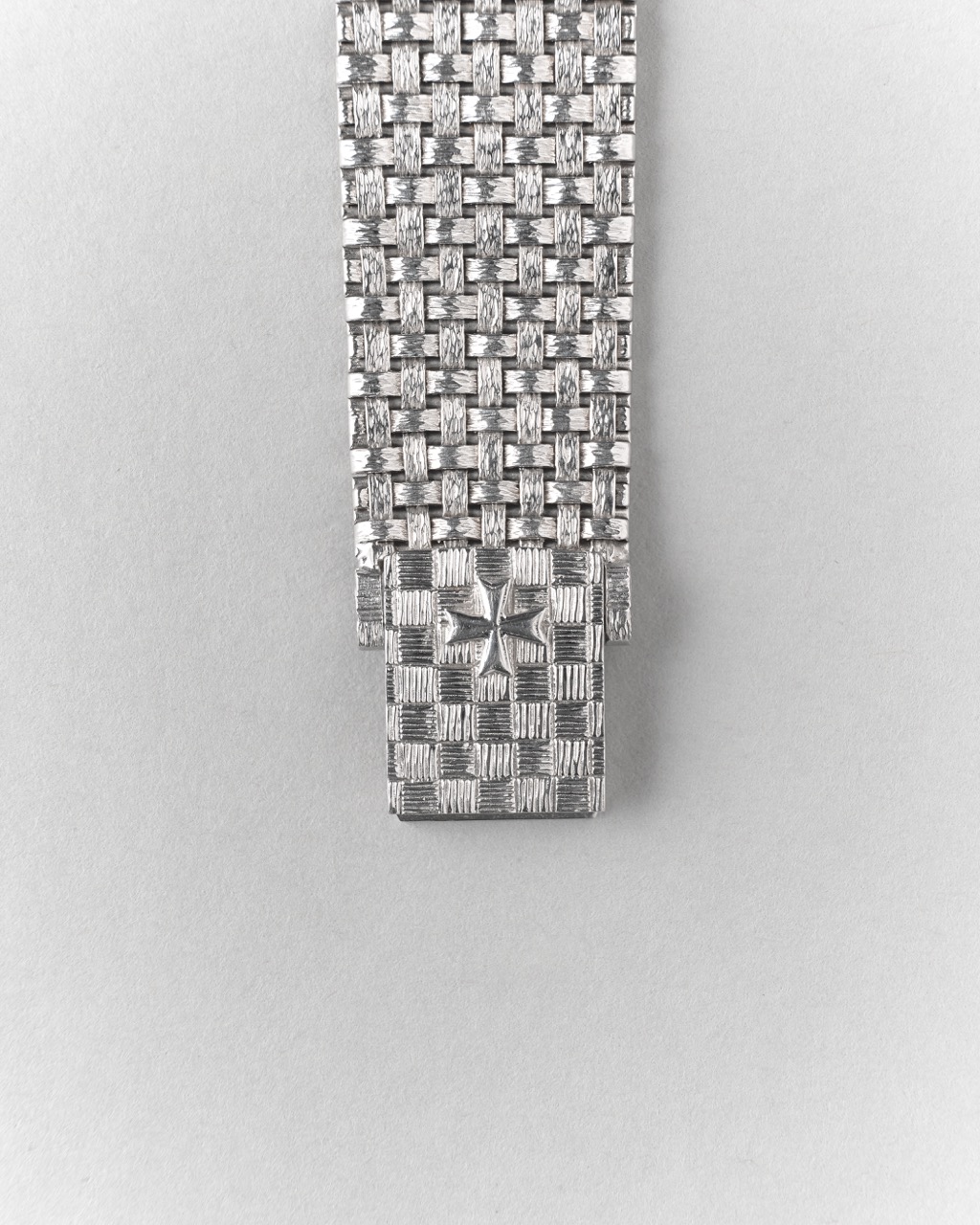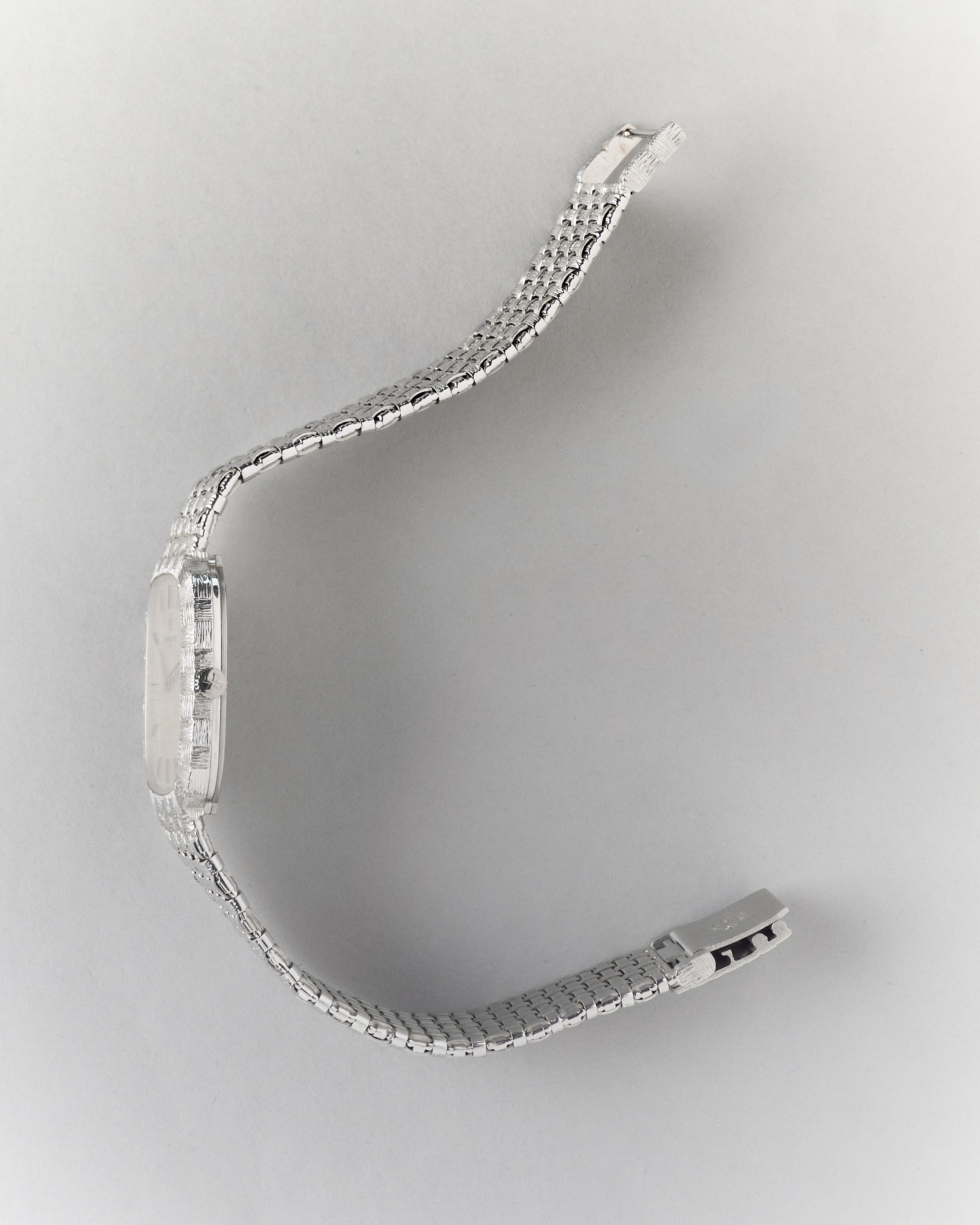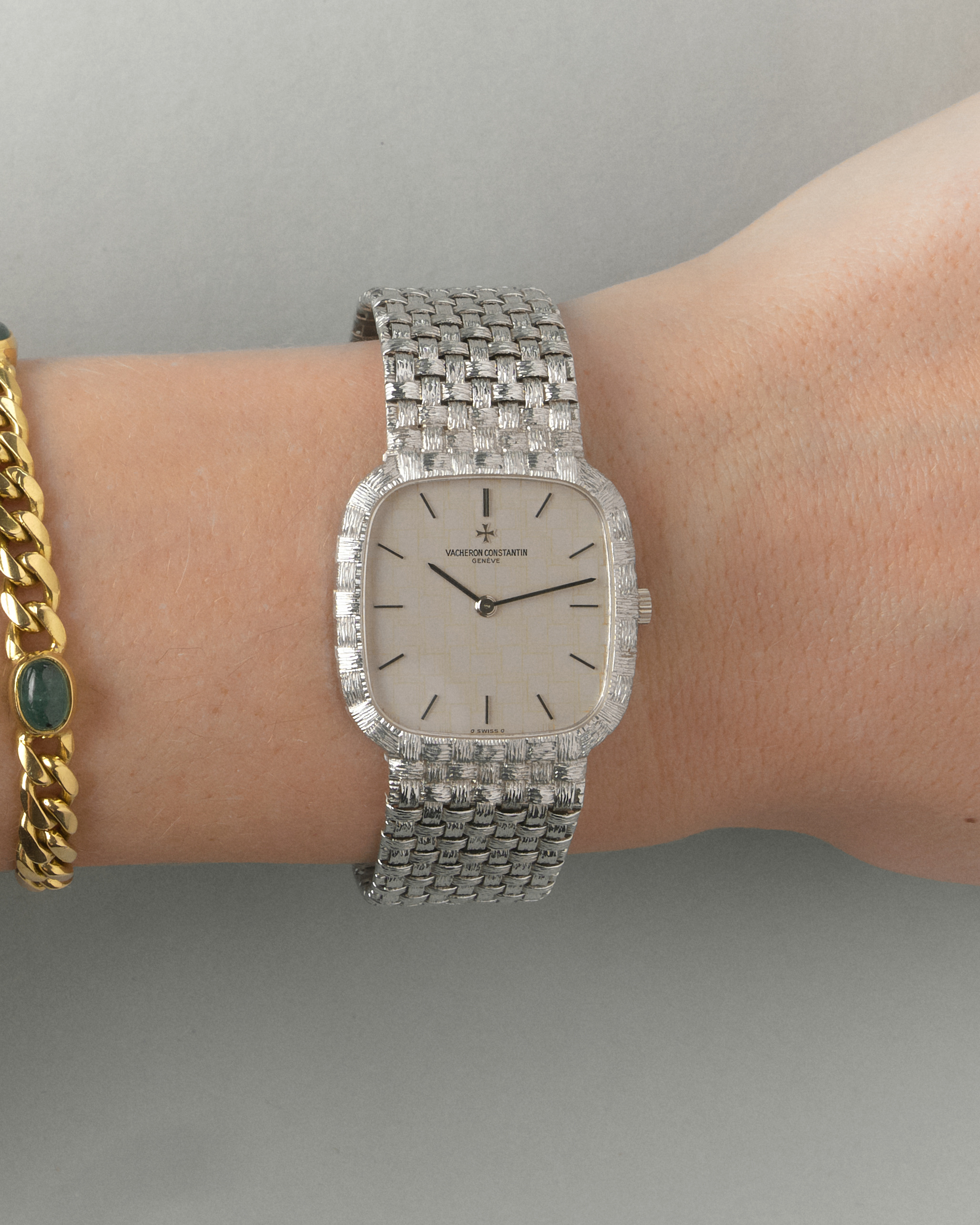 The Vacheron Constantin Ref. 2099 in 18k white gold is a refined study in texture, proportion, and quiet sophistication. Measuring 29 mm, the softly rounded case is paired with an intricately braided white-gold bracelet that gives the watch a distinctive tactile presence. The silver dial, kept intentionally minimal, features subtle detailing that complements rather than competes with the surrounding metalwork. Powered by an automatic movement, this piece balances technical substance with an unmistakably elegant, jewelry-like form.